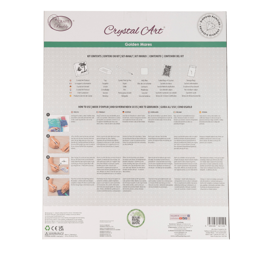 Bring a touch of the summer countryside into your home with the ‘Golden Mares’ Crystal Art® Canvas Kit from Craft Buddy. This gentle pair of mares - young and old - stand peacefully by a rustic fence, creating a beautifully calm and heartwarming scene. Perfect for horse lovers, this design transforms any space into a tranquil haven. This 40 x 50cm kit includes everything you need to create a dazzling full-crystal masterpiece, including a pre-stretched adhesive canvas, sparkling resin crystals, and all essential tools. Enjoy a relaxing and rewarding crafting experience as you bring this stunning design to life.