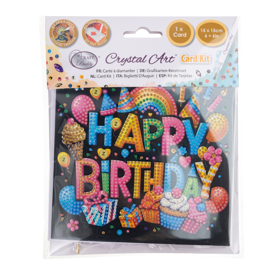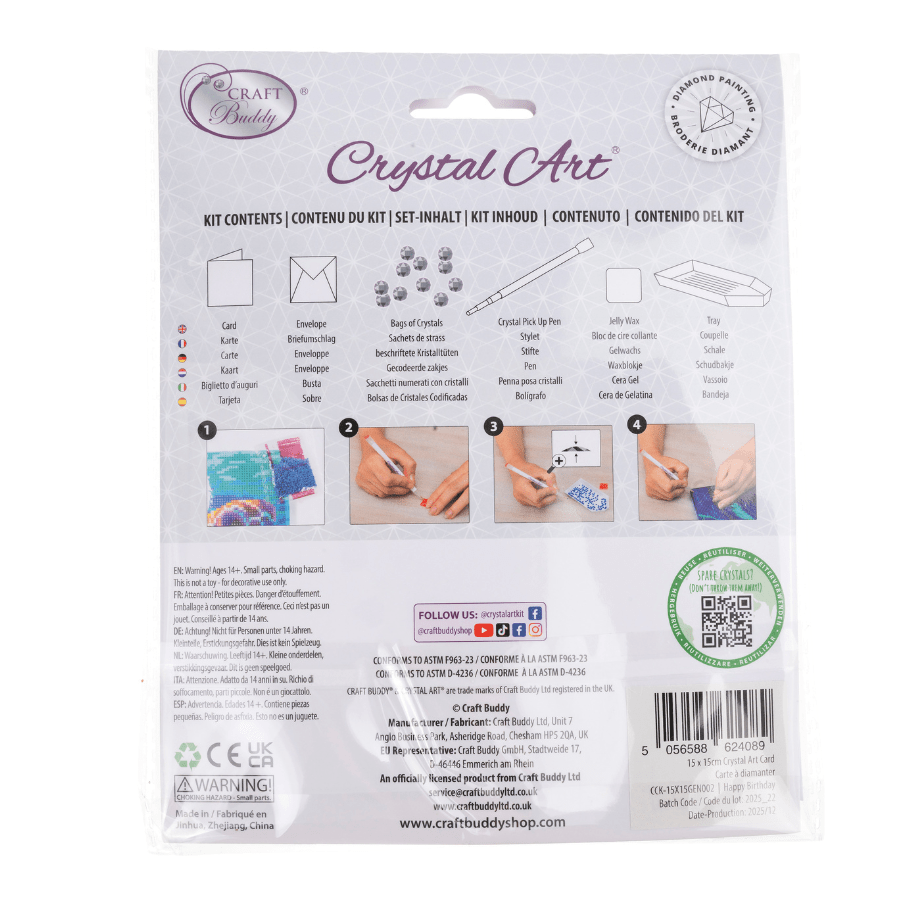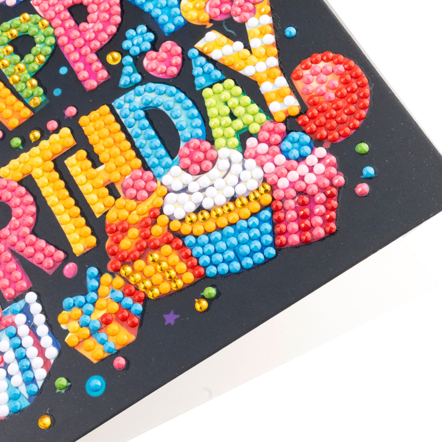 Each Crystal Art® card design has a numbered adhesive template so just use the handy pick up tool to lift up the coloured crystals and place them on the corresponding numbered dots. All tools are included, as well as instructions and a plain white envelope. Perfect for celebrating birthdays at any age, this handmade-style card offers a fun and creative experience for diamond artists of all abilities, resulting in a dazzling keepsake made with love.