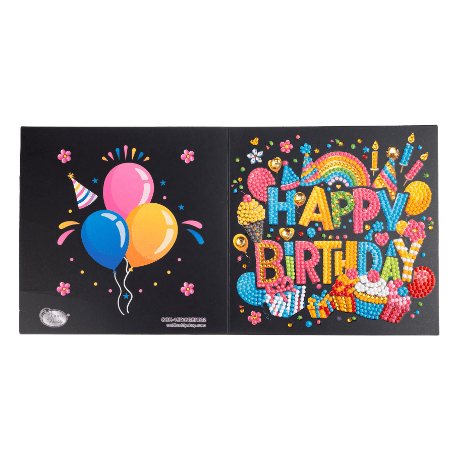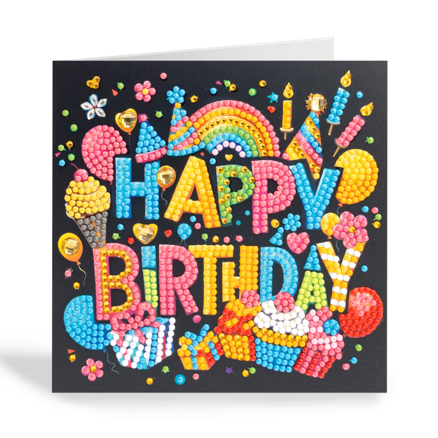 The Craft Buddy 'Happy Birthday' Crystal Art Card features a bold, joyful message guaranteed to raise a smile on the recipient’s special day. Set against a striking black background, the vibrant rainbow typography truly sparkles, with playful birthday motifs such as candles, cupcakes and gifts adding extra joy.